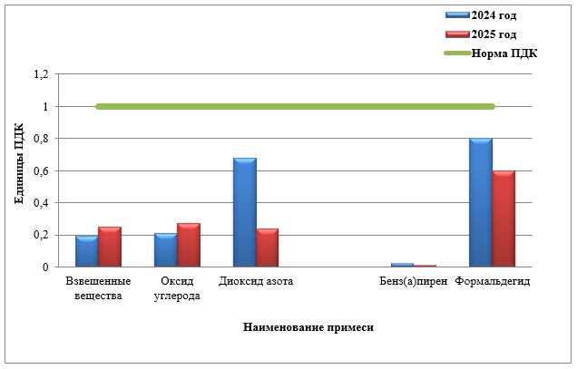 Как следует из диаграммы (график 1) по сравнению с июлем 2024 г. наблюдается снижение уровня загрязнения атмосферного воздуха в 2025 г., диоксидом азота в 2,8 раза, бенз(а)пиреном в 2 раза и формальдегидом в 1,3 раза. Повышение уровня загрязнения атмосферного воздуха в 2025 г взвешенными веществами (пылью) в 1,3 раза и оксидом углерода в 1,3 раза.