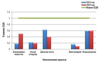 Как следует из диаграммы (график 1) по сравнению с сентябрем 2024 г. наблюдается снижение уровня загрязнения атмосферного воздуха в 2025 г., диоксидом азота и бенз(а)пиреном в 1,6 раз и оксидом углерода в 1,1 раз. Повышение уровня загрязнения атмосферного воздуха отмечено в 2025 г взвешенными веществами (пылью) в 2,8 раза.